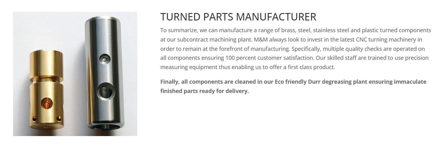 are manufactured for a customer base spanning the North America, AU, and Europe. We machine a range of materials including steel, stainless steel, brass, aluminium and similarly plastic. Above all, M&M are capable of machining parts from 2mm dia to 65mm dia in batch sizes of 200 components to 100,000 upwards.